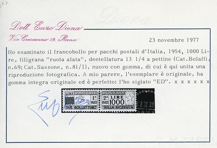 1954 - 1.000 lire Cavallino, filigrana ruota (81), ben centrato, nuovo, gomma originale integra, perfetto. Cert. Enzo Diena 1977.