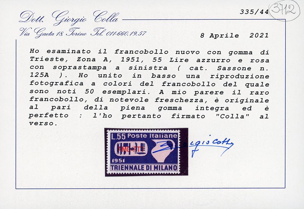 1951 - 55 lire Triennale di Milano, soprastampa a sinistra (125A), nuovo, gomma originale integra, perfetto e molto fresco. Raro, tiratura 50 esemplari, ottima qualità. Cert. Colla.