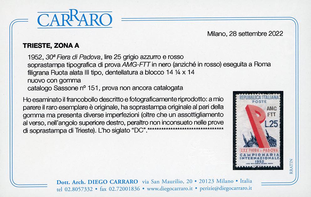 Lotto 1598 - 1952 - 25 lire Fiera di Padova, soprastampa di prova in ...