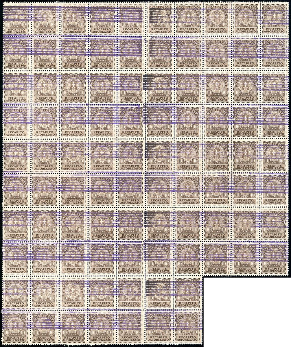 TORINO 1944 - 10 cent. recapito autorizzato, soprastampato con sei/otto linee parallele in violetto (CEI 1,2), foglio quasi completo di novantaquattro esemplari in cui si alternano una riga con la doppia soprastampa con sei linee e una con otto linee, nuovo gomma originale integra, perfetto. Si tratta probabilmente del massimo multiplo noto di questo francobollo, non catalogato dal Sassone. Rarità del settore. Cert. Ferrario.