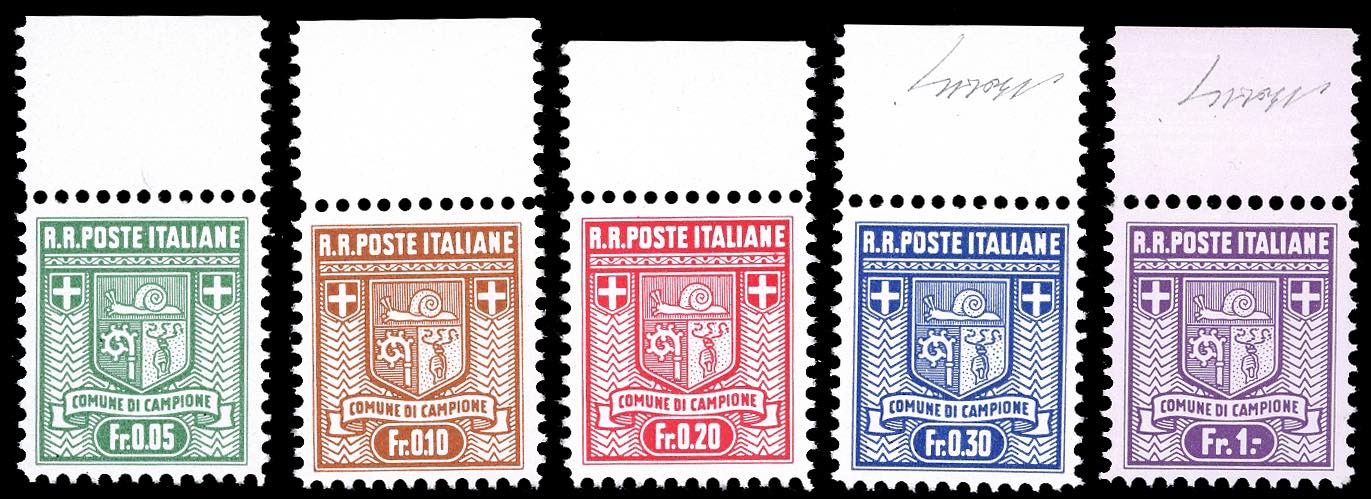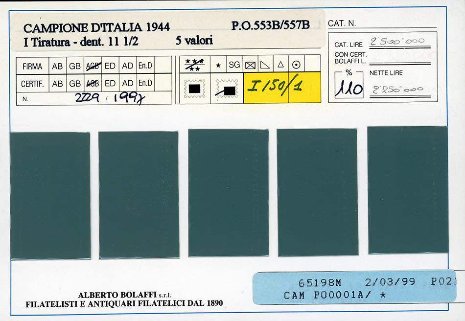 CAMPIONE D'ITALIA 1944 - Prima tiratura, dent. 11 1/2, serie completa (1a/5a), bordo di foglio, gomma originale integra, perfetti e di ottima qualità. Molto belli. Cert. Finanziario Bolaffi 110% per gli alti valori.