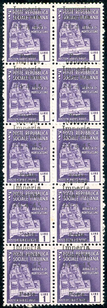 IMPERIA 1945 - 1 lira, soprastampa fortemente spostata in alto (8c), blocco di 10 esemplari, gomma integra, perfetti. Molto bello. Cert. Raybaudi.