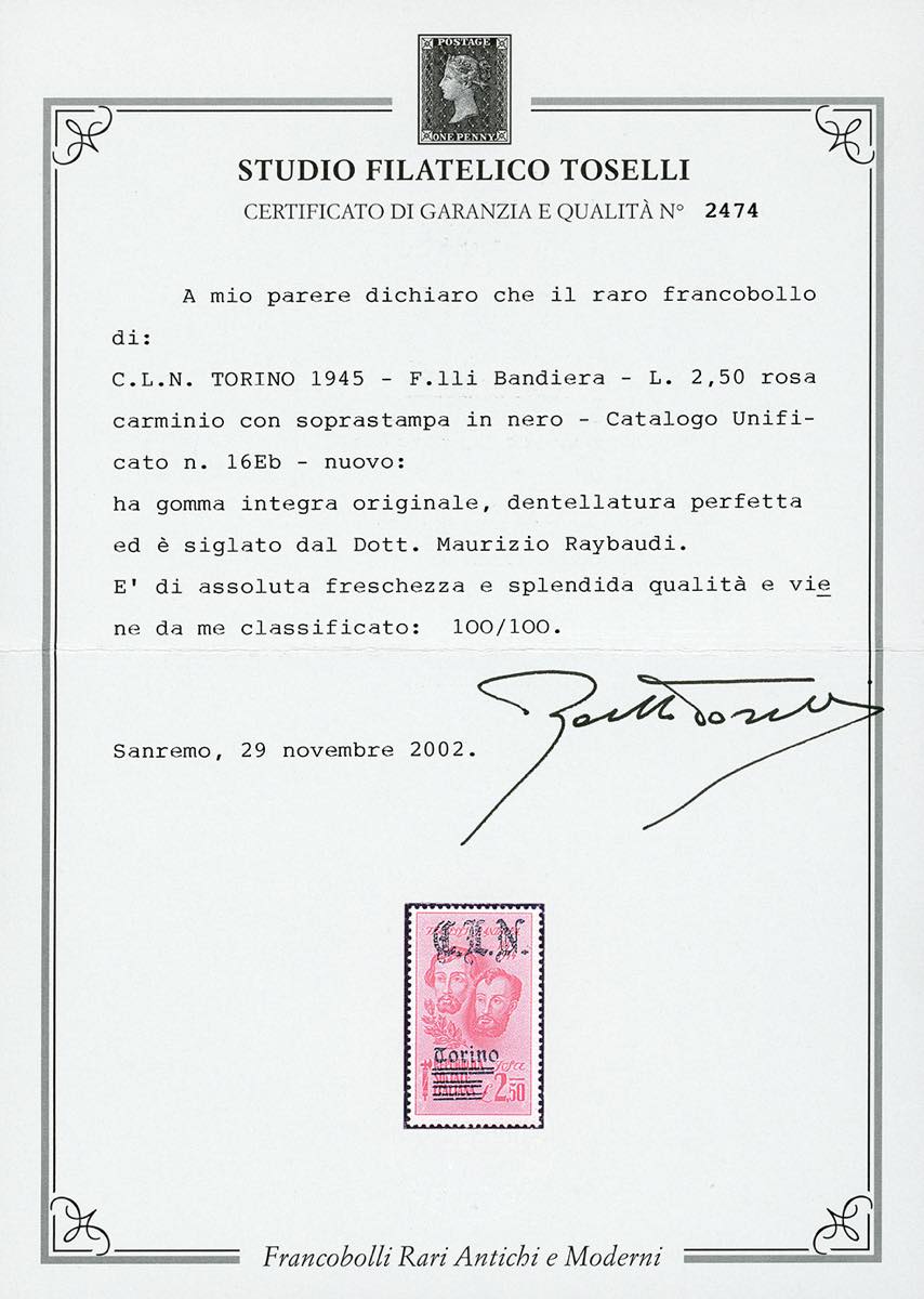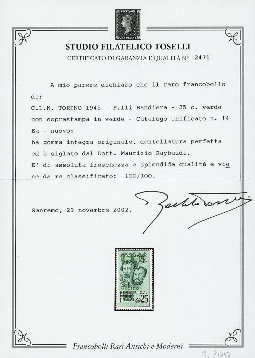 TORINO 1945 - Fratelli Bandiera, 25 e 50 cent. soprastampa verde anziché rossa, 2,50 lire, un esemplare con soprastampa rossa anziché verde, uno con soprastampa nera anziché verde (Errani Raybaudi vedi nota,CEI P32/P34,Unificato 14 e 15,16f,16g), gomma originale integra, perfetti. Allestiti a titolo di prova. Rarissimi, pochi esemplari esistenti, probabile tiratura 50 serie. Raybaudi, cert. Toselli.