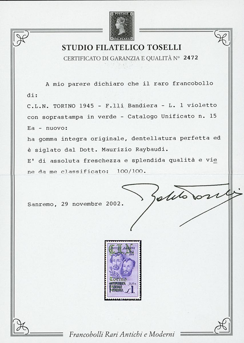 TORINO 1945 - Fratelli Bandiera, 25 e 50 cent. soprastampa verde anziché rossa, 2,50 lire, un esemplare con soprastampa rossa anziché ... Leggi tutto