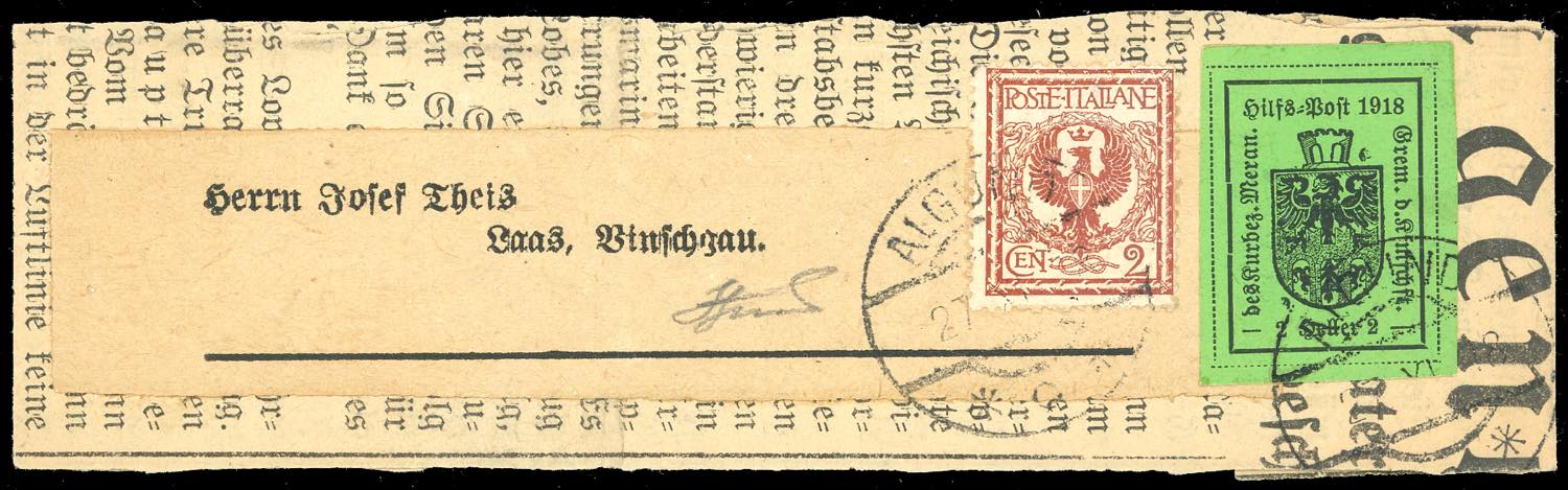 MERANO 1918 - 2 h. verde (6), perfetto, in affrancatura mista con 2 cent. Floreale del Regno d'Italia (69), perfetto, su fascetta completa da Algund 27/11/1918 a Laas. Bella. Ferrario.