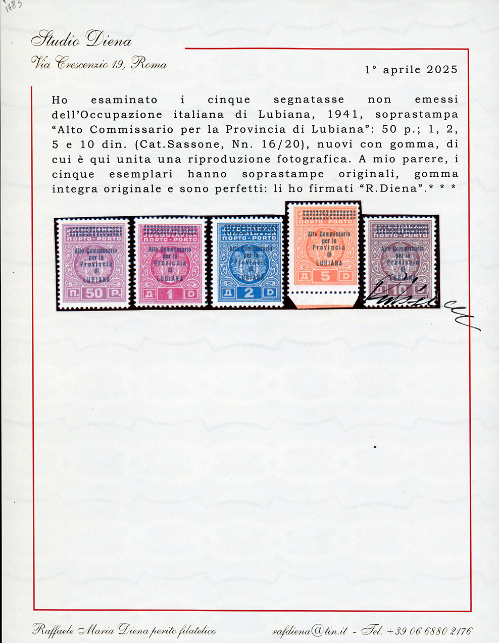 LUBIANA SEGNATASSE 1941 - Soprastampati "Alto Commisario", non emessi, serie completa (16/20), nuovi, gomma originale integra, perfetti. Molto rari, solo 42 serie complete note, molte delle quali senza gomma o difettose. Cert. A.Diena e Ferrario.