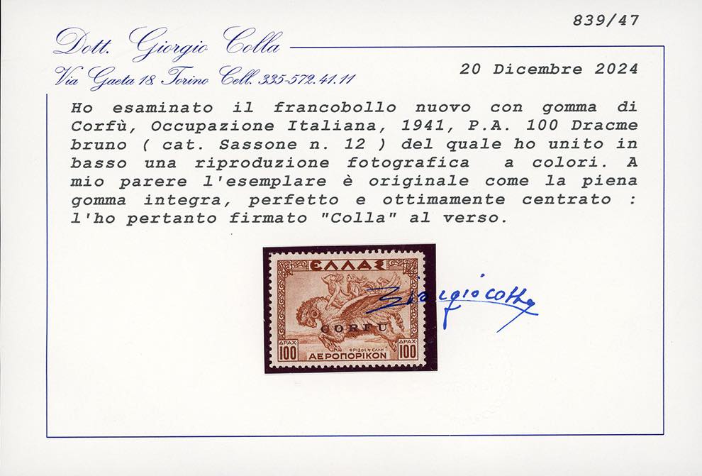 Lotto 1787 - CORFU' POSTA AEREA 1941 - 100 d. soprastampata (12), nuovo, ...