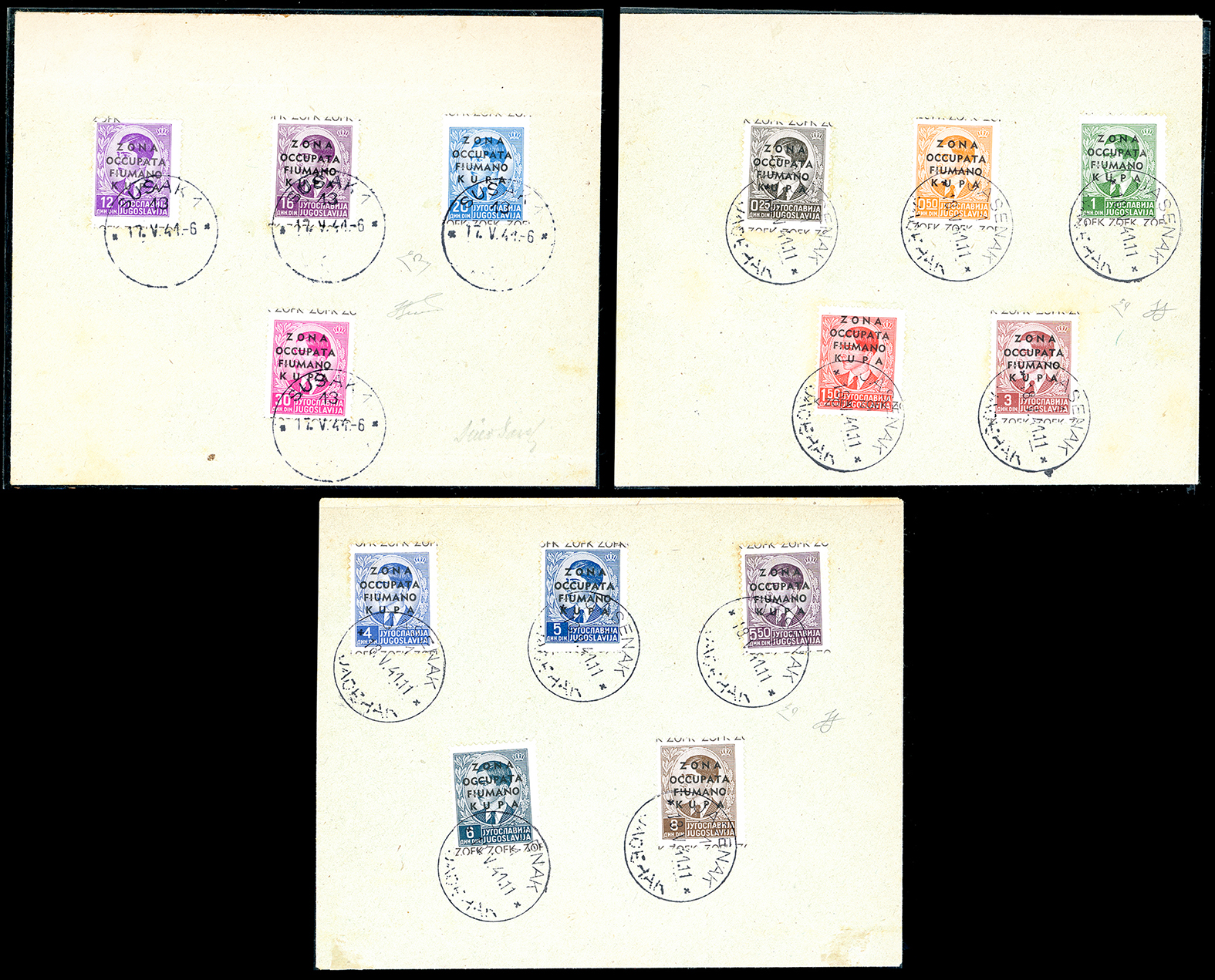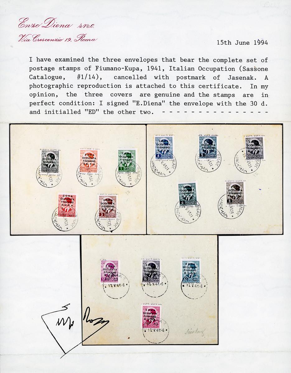 ZONA FIUMANO KUPA 1941 - Soprastampati, serie completa (1/14), perfetti, su tre buste senza indirizzo con annullo Susak 17/5/1946. Insieme molto raro. Cert. E.Diena e Ferrario. (cat.Sassone € 42.350/53.000).