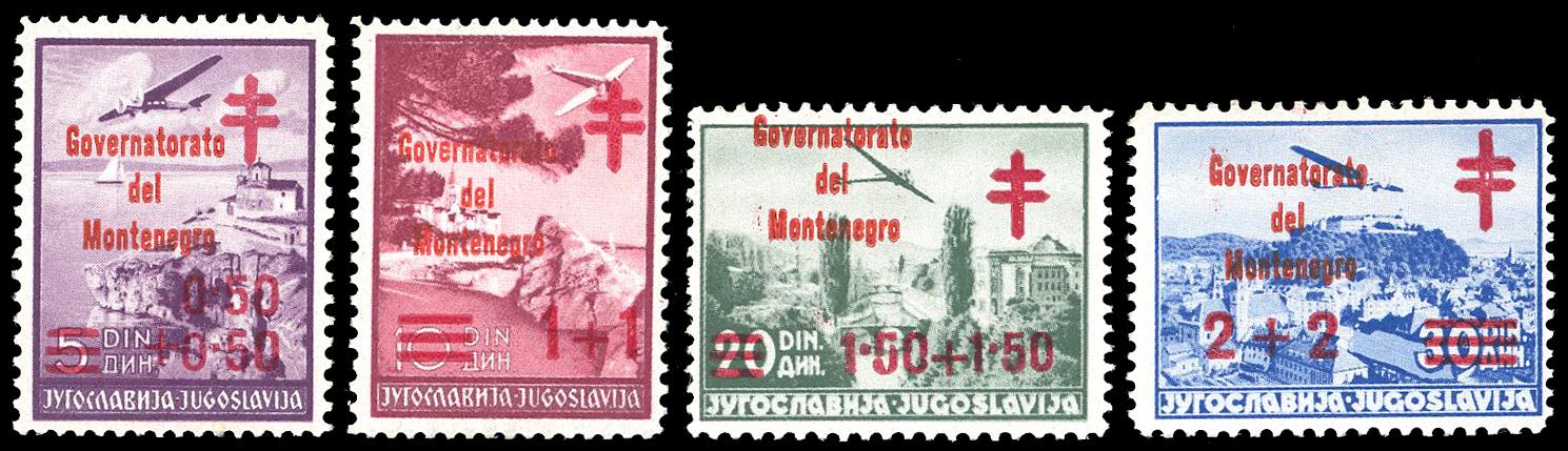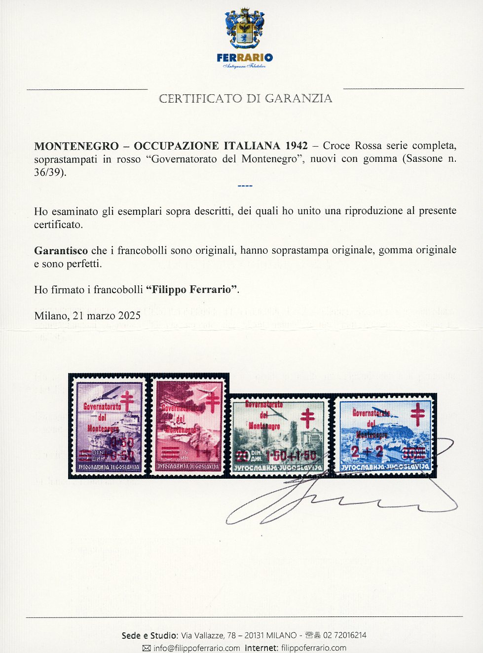MONTENEGRO 1942 - Croce Rossa, soprastampati in rosso, serie completa (36/39), nuovi, gomma originale, perfetti. Rari, tiratura 200 serie. G.Oliva, Sassone, cert. Ferrario.