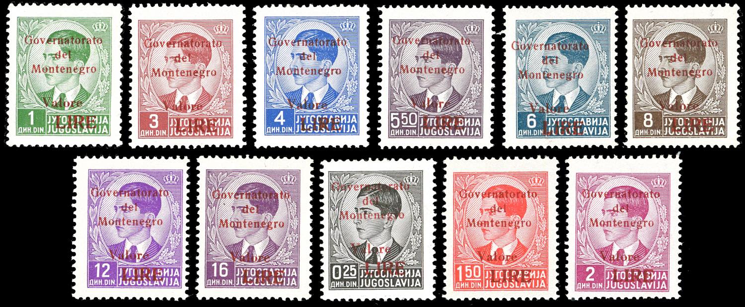 MONTENEGRO 1942 - Soprastampati in carminio, serie completa (49/59), nuovi, gomma originale, leggerissima traccia di linguella, perfetti. A.Diena e cert. Ferrario per gli alti valori.