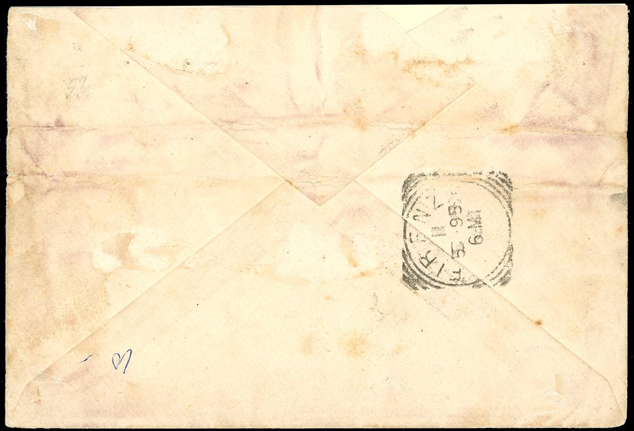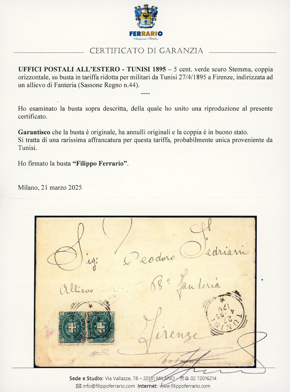 TUNISI 1895 - 5 cent. Stemma (44), coppia perfetta, su busta in TARIFFA RIDOTTA PER MILITARI da Tunisi 27/4/1895 a Firenze, indirizzata ad un allievo di Fanteria. Rarissima affrancatura per questa tariffa, probabilmente unica. Cert. Ferrario.