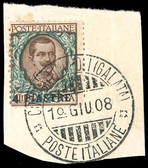 COSTANTINOPOLI 1908 - 4 pi. su 1 lira soprastampato, I emissione locale (6), buono stato, usato su frammento a Costantinopoli 1/6/1908, ... Leggi tutto