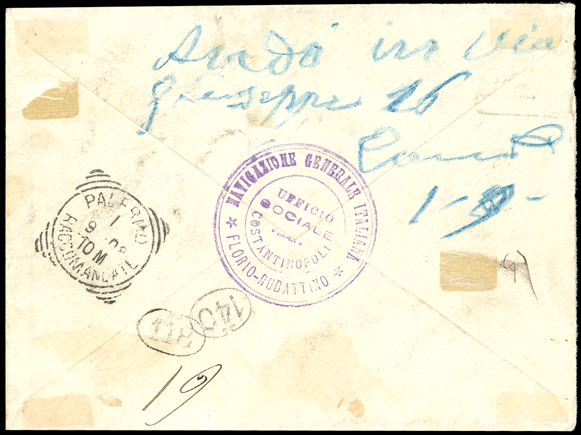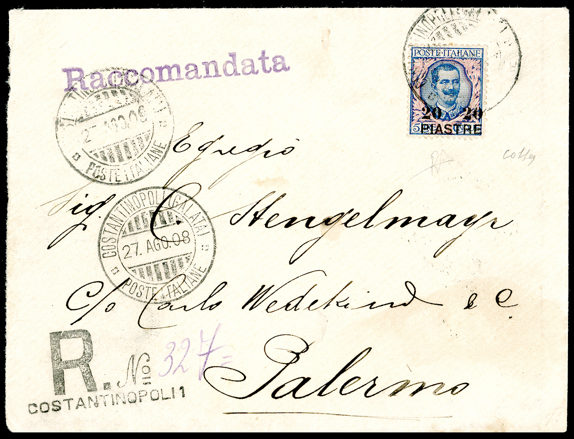COSTANTINOPOLI 1908 - 20 pi., su 5 lire, III emissione locale (17), perfetto, isolato su busta raccomandata da Costantinopoli 27/8/1908 a Palermo, bollo d'arrivo, trasportata con la compagnia di navigazione Florio-Rubattino. Rara lettera risalente al primo mese d'uso. R.Diena, cert. Colla.