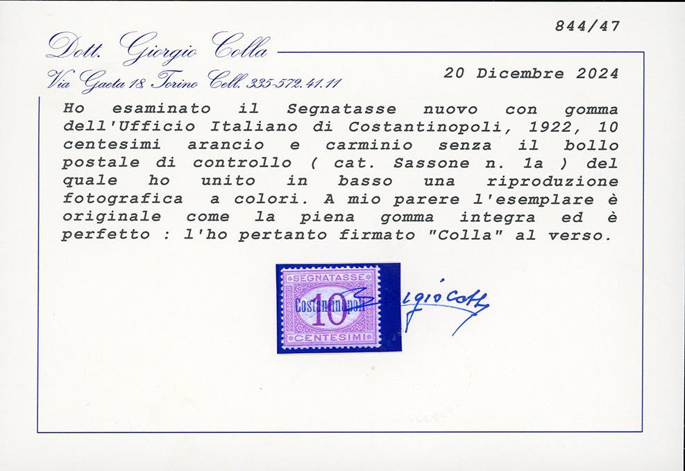COSTANTINOPOLI SEGNATASSE 1922 - 10 cent. soprastampato, senza il bollo postale di controllo (1a), tagli incrociati di demonetizzazione, nuovo, gomma originale integra, perfetto e molto fresco. Raro. Cert. Colla.