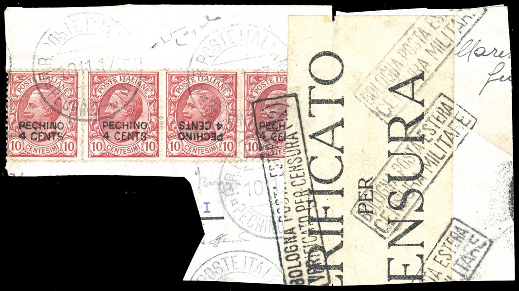 PECHINO 1917 - 4 cent. su 10 cent. Leoni, soprastampa locale a mano, striscia orizzontale di tre con un esemplare con soprastampa capovolta e singolo (2h,2), perfetti, usati su ampio frammento di busta da Pechino 10/11/1971, bolli e fascetta di censura. Insieme raro. Bargagli, Ferrario, cert. Raybaudi.