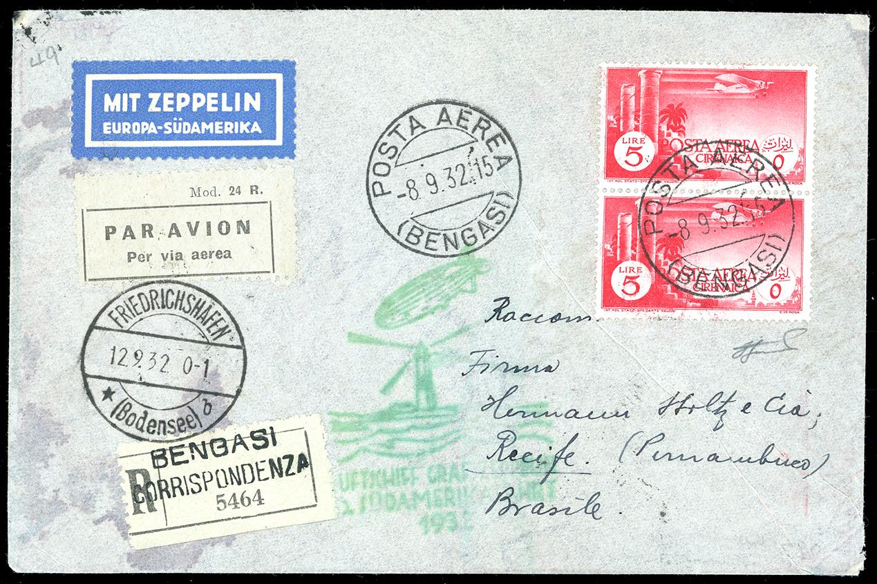POSTA AEREA 1932 - 5 lire Soggetti Africani (A11), coppia perfetta, su aerogramma raccomandato da Bengasi 8/9/1932 a Recife in Brasile, viaggiato con il dirigibile Graf Zeppelin, 6°Sudamerikafahrt, come da speciale cachet apposto al recto. Non comune. Cert. Ferrario.