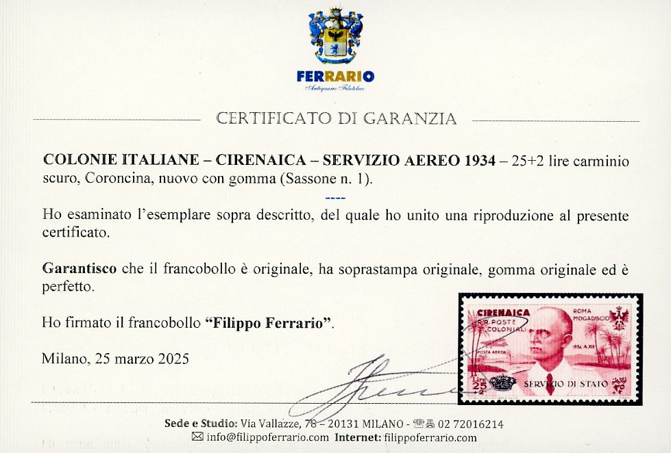 SERVIZIO AEREO 1934 - 25 + 2 lire Coroncina (1), nuovo, gomma originale, leggerissima traccia di linguella, perfetto. G.Bolaffi, E.Diena, cert. Ferrario.