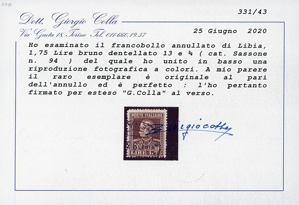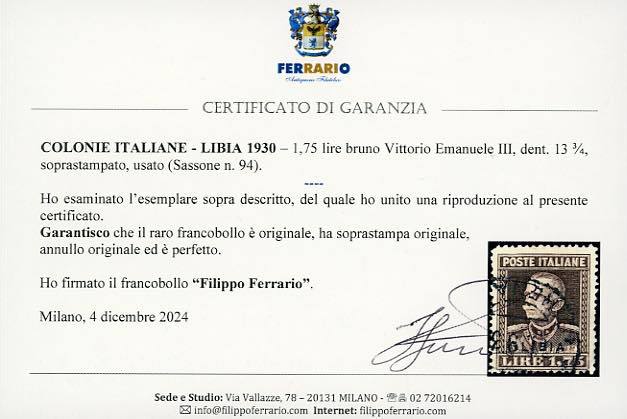 1930 - 1,75 lire bruno Vittorio Emanuele III, dent. 13 3/4 (94), usato, perfetto. Molto raro. A.Diena, cert. Colla e Ferrario.