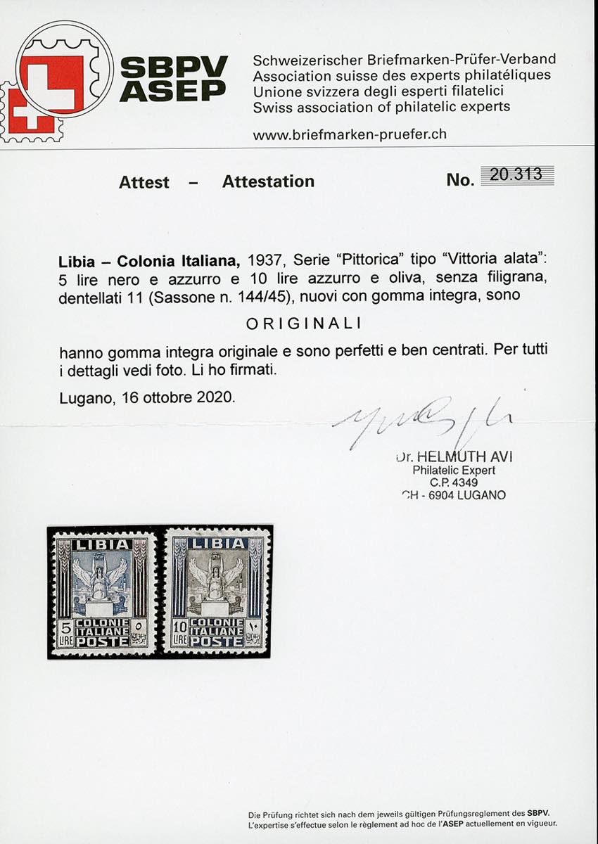 1937 - 5 lire e 10 lire Pittorica, senza filigrana, dent. 11 (144/145), gomma originale integra, perfetti. Molto freschi. Cert. Avi.