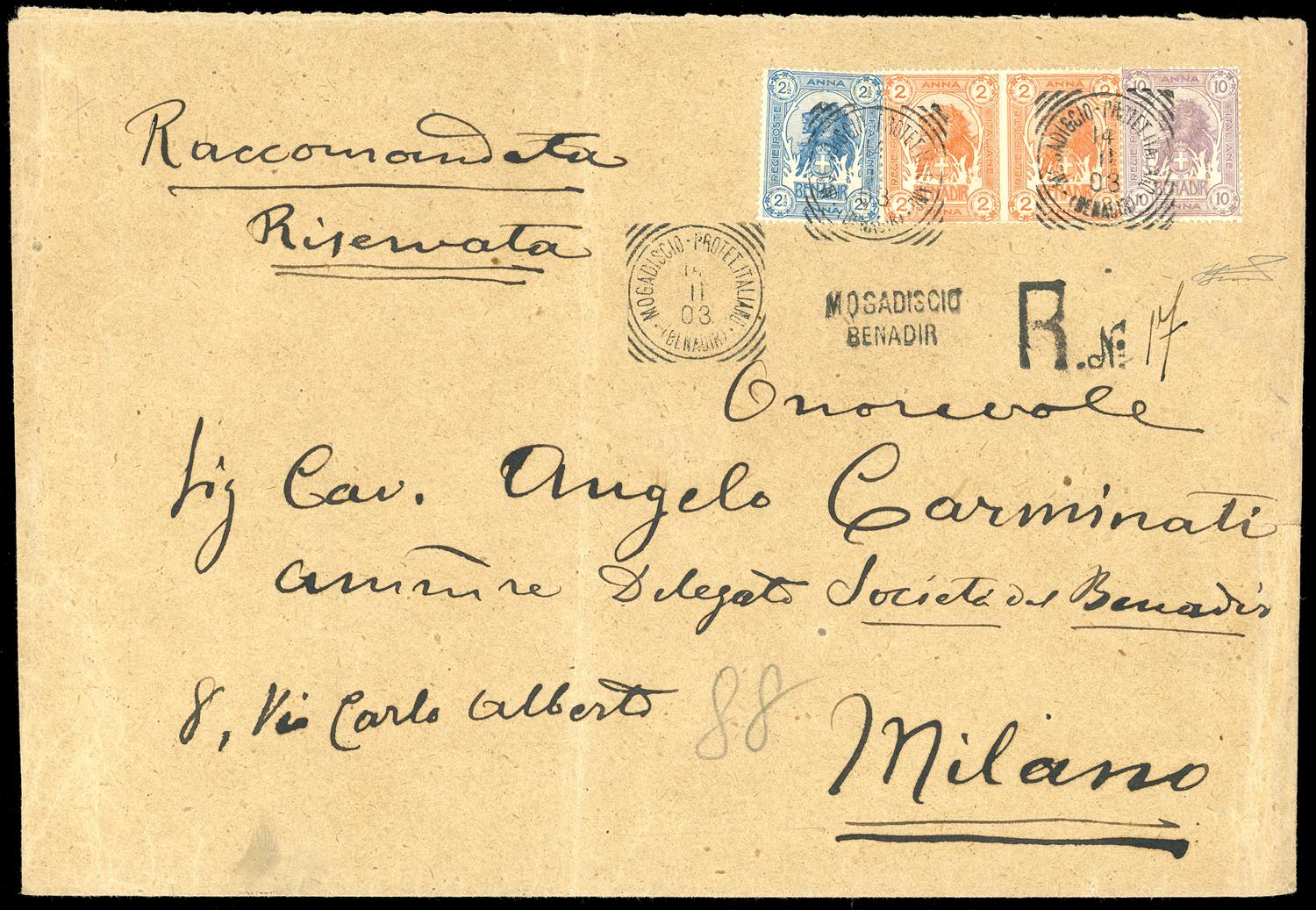 1903 - 10 anna, 2 anna, coppia, 2 1/2 anna Leoni (7,4,5), perfetti, su busta raccomandta da Mogadiscio 14/11/1903 a Milano. L'uso non filatelico dell'alto valore da 10 anna in tariffa è estremamente raro, pochissimi casi noti. Rarità del settore. Ferrario.