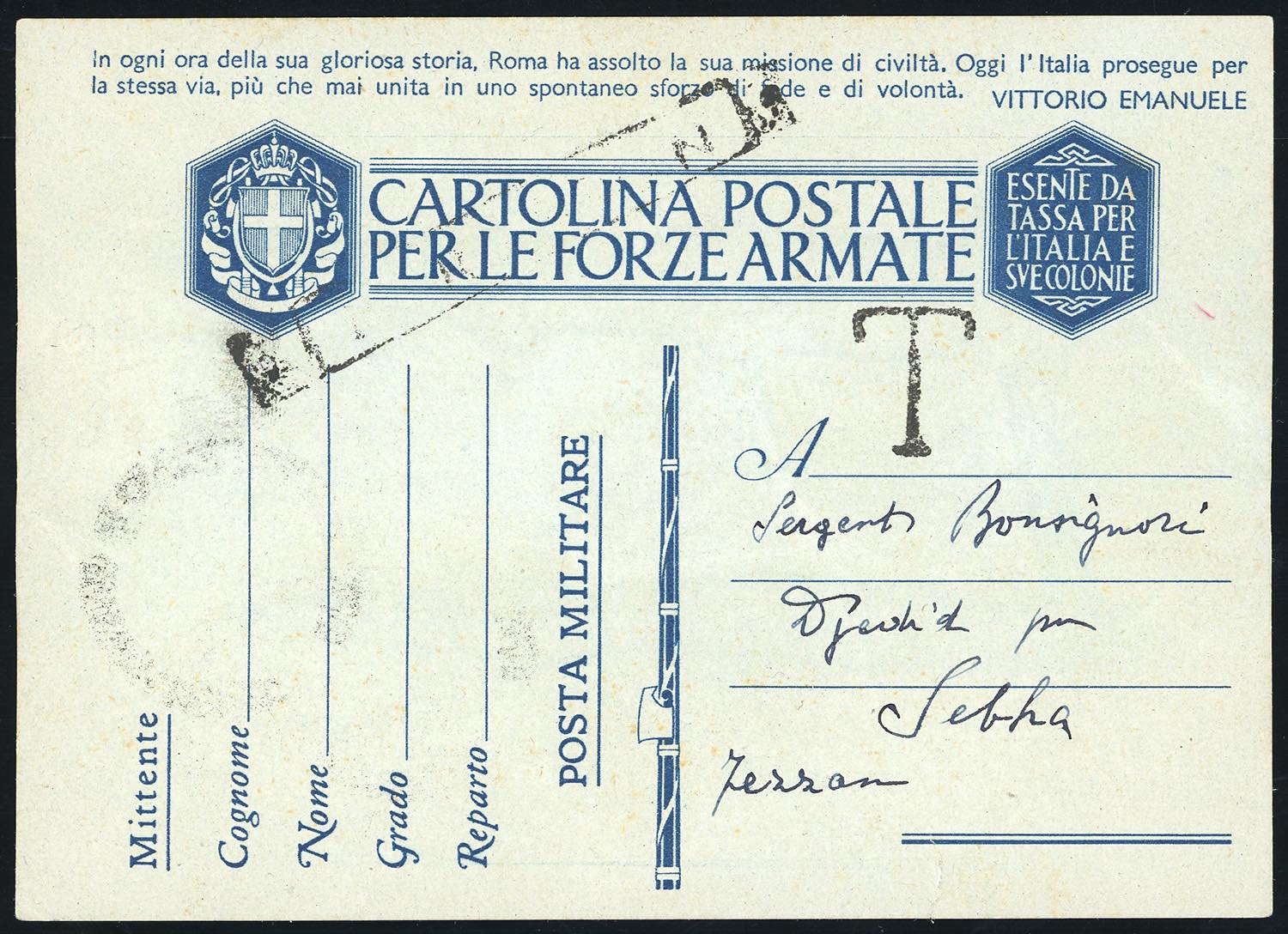 OCCUPAZIONE FRANCESE FEZZAN SEGNATASSE 1943 - Soprastampati, serie completa (1/5), perfetti, al verso di cartolina per le forze armate, usata a Sebha 25/5/1943. SI TRATTA DELL'UNICO CASO SU CORRISPONDENZA DEL RARISSIMO 5 FRANCHI. Giulio Bolaffi per esteso, cert. A.Diena e Ferrario.