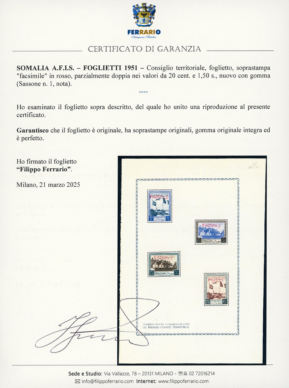 SOMALIA A.F.I.S. FOGLIETTI 1951 - Consiglio territoriale, foglietto con soprastampa "FACSIMILE" in rosso, parzialmente doppia nei valori da 20 cent. e 1,50 s. (1,nota), nuovo, gomma originale integra, perfetto. Avanzo, cert. Ferrario.