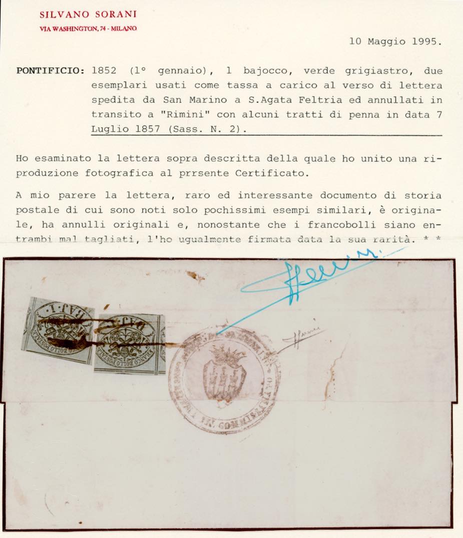 1857 - 1 baj verde grigiastro (2), due esemplari tagliati irregolarmente, al verso di sovracoperta di lettera in porto assegnato da San Marino, doppio cerchio di Rimini 7/7/1857 sul fronte, a S.Agata Feltria, tassata 2 baj. Le lettere da S.Marino con la prima emissione di Pontificio sono estremamente rare, solo una quindicina di documenti conosciuti. Colla, cert. Sorani.