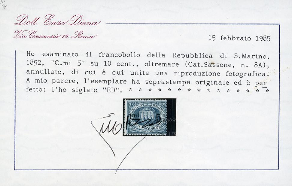 1892 - 5 cent. su 10 cent. oltremare (8A), usato, perfetto. Raro e di ottima qualità. Alberto Diena, cert. Enzo Diena.