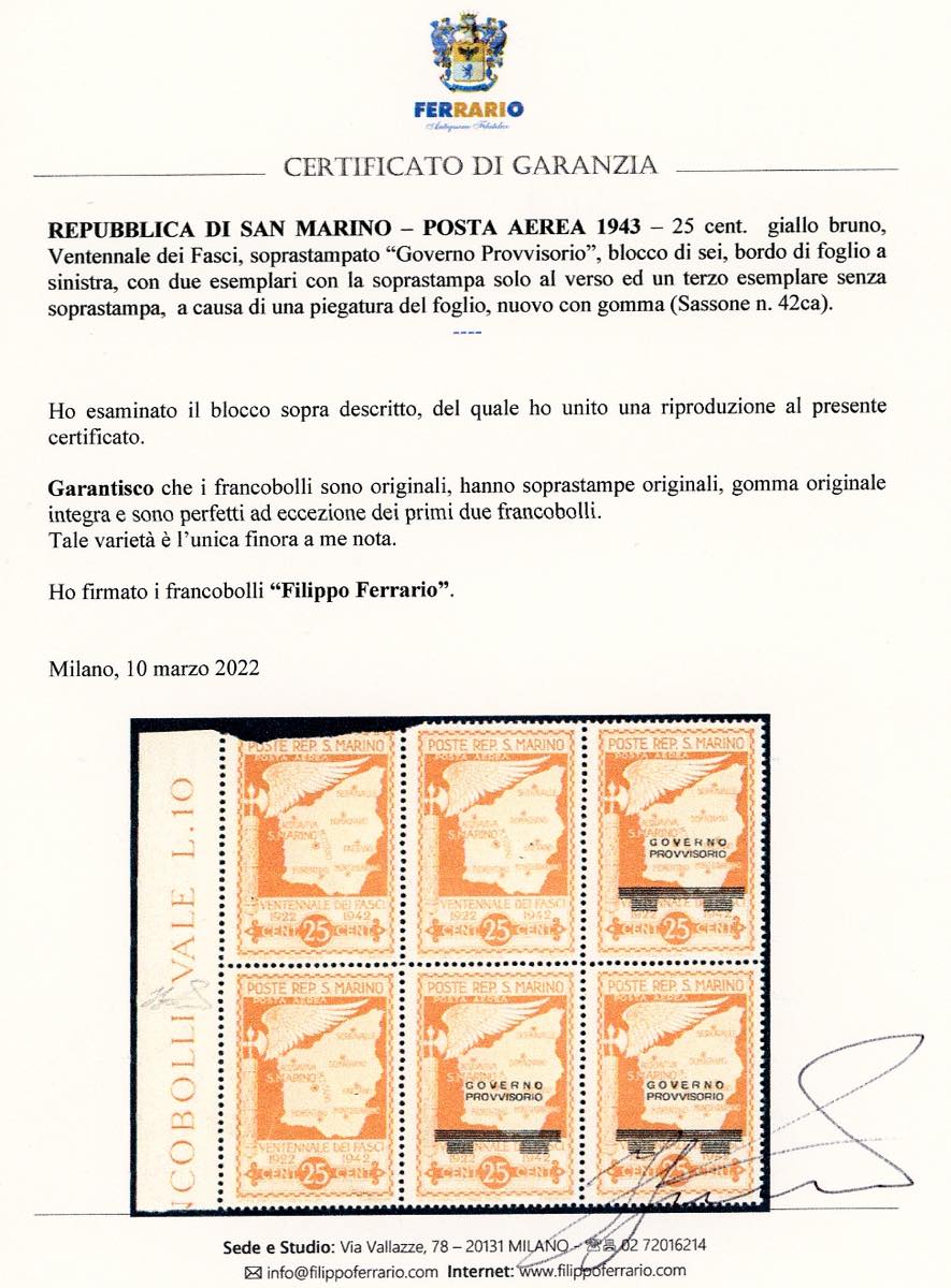 1943 - 25 cent. soprastampato "Governo Provvisorio", blocco di sei, due esemplari con la soprastampa solo al verso, uno senza soprastampa, a causa di una piegatura del foglio al momento della sovraimpressione (42ca), bordo di foglio, gomma originale integra. Da notare che in tale blocco si crea una coppia tra il francobollo non emesso ed uno soprastampato. INSIEME UNICO, RARITA' DEL SETTORE. Cert. Avanzo e Ferrario.