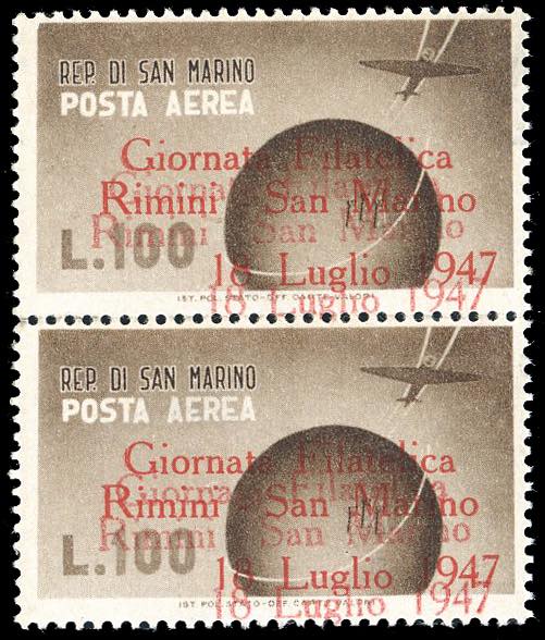 1947 - 100 lire soprastampato "Giornata Filatelica", doppia soprastampa (72b), coppia verticale, l'esemplare inferiore con decalco della ... Leggi tutto