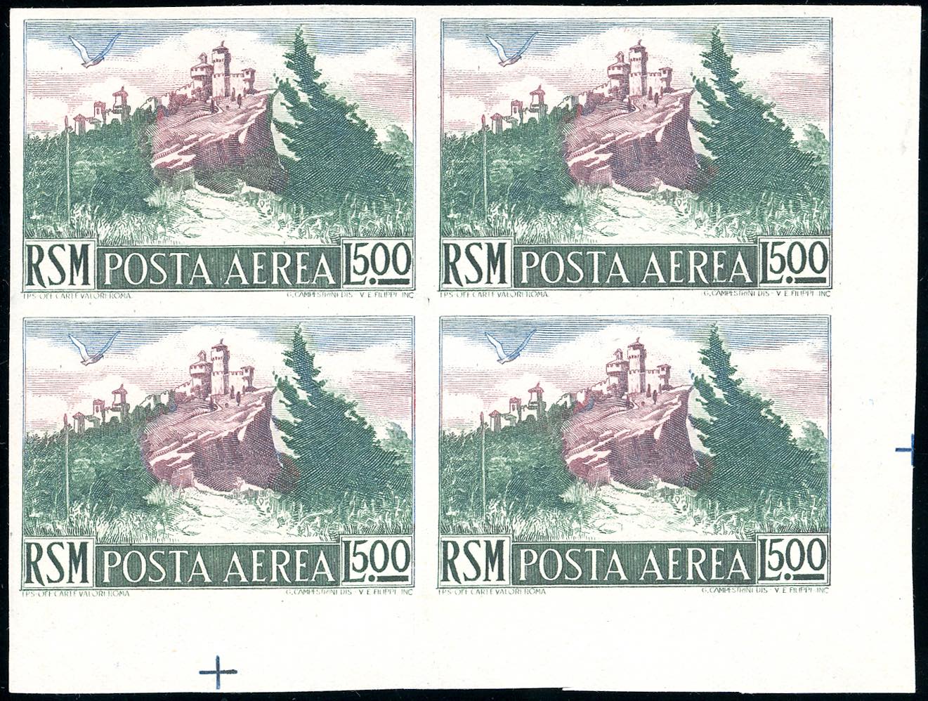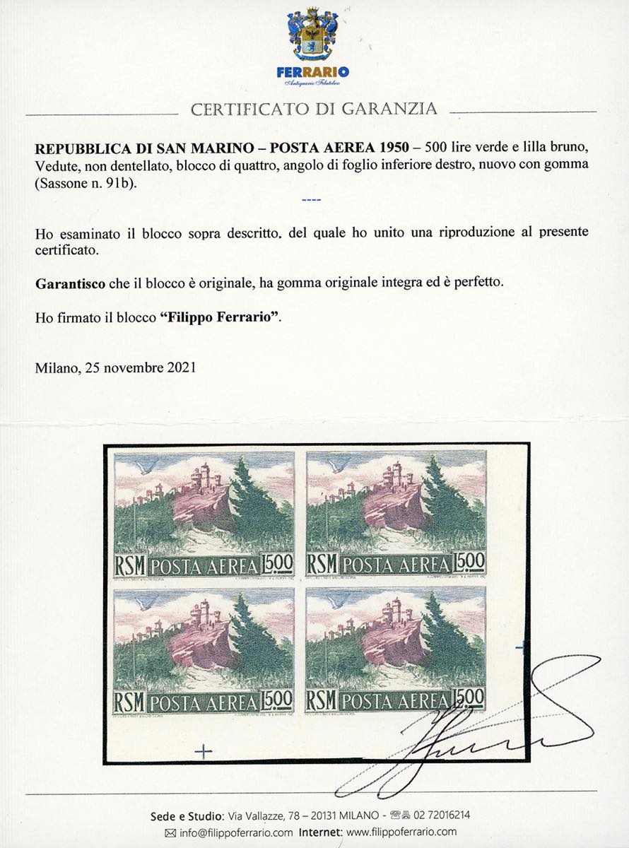 1950 - 500 lire Vedute, non dentellato (91b), blocco di quattro, angolo di foglio, gomma originale integra, perfetto. Bello e raro. Cert. ... Leggi tutto