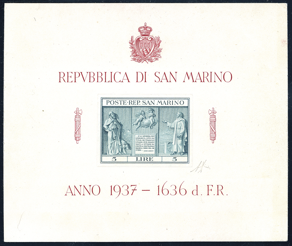1937 - 5 lire Indipendenza, foglietto (1), prova con diciture in rosso, colore non adottato, con applicata al centro la prova calcografica non dentellata del francobollo nel colore adottato, nuova senza gomma, perfetta. UNICO ESEMPLARE NOTO. Cert. A.Diena e Oro Raybaudi.