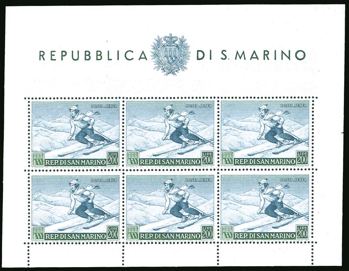 1953 - 200 lire Sciatrice, foglietto (15), nuovo, gomma originale, traccia di linguella sul bordo.