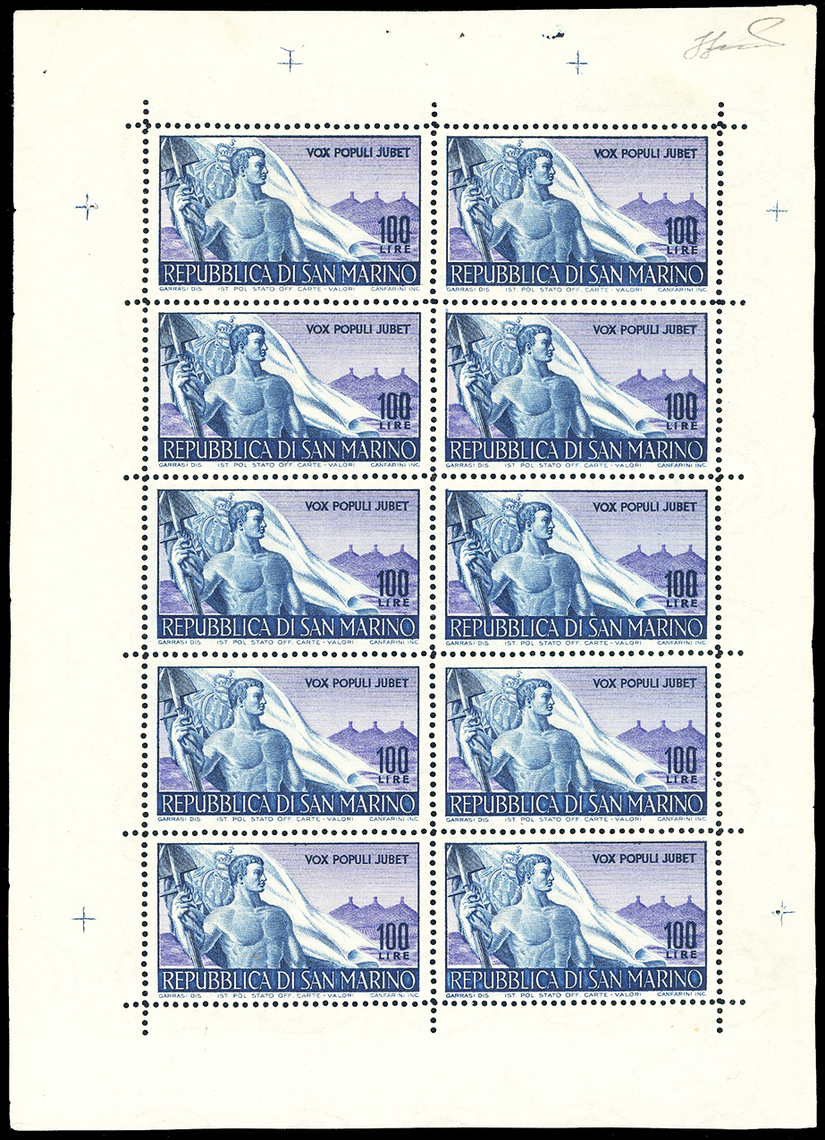 1948 - 100 lire Lavoratori, minifoglio (9), nuovo, gomma originale integra, perfetto, senza pieghe. Molto fresco. Cert. Giordani 1987 e Ferrario.