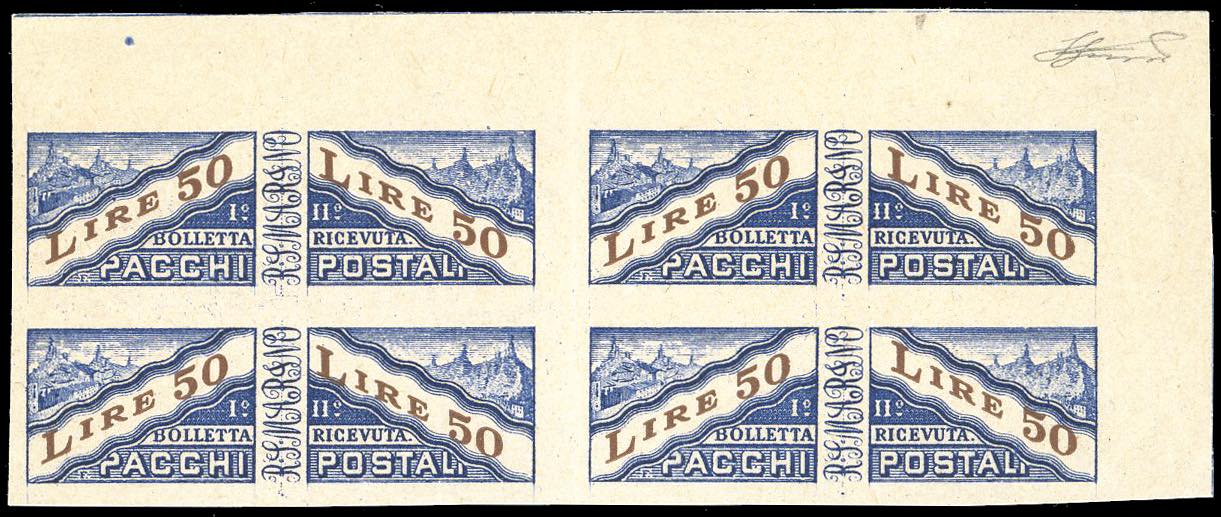 1946 - 50 lire blu e bruno (32), prova di macchina in colori adottati su carta grigiastra, senza filigrana, non dentellata, blocco di quattro, angolo di foglio, senza gomma come sempre, perfetto. Molto raro. A.Diena, Ferrario, cert. Raybaudi.