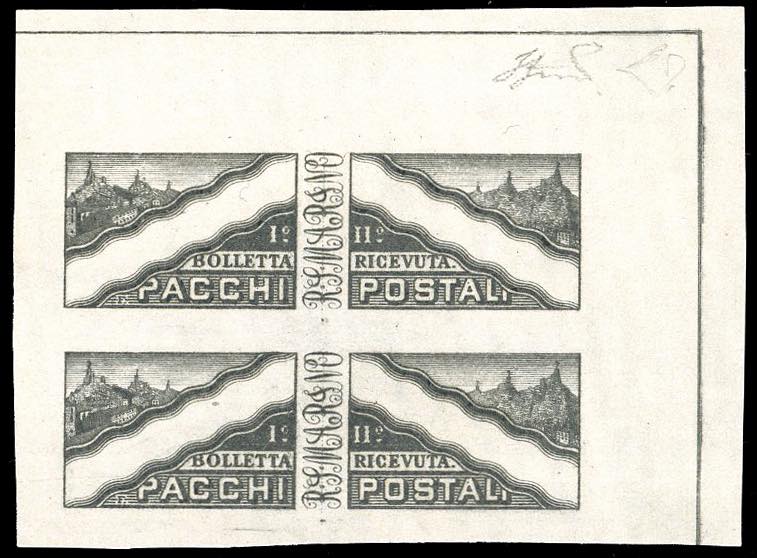 1928 - Prova in nero grigio, senza indicazione del valore del francobollo per pacchi, su carta avorio senza filigrana, non dentellata, coppia verticale, angolo di foglio, senza gomma come sempre, perfetta. Molto rara. E.Diena, Ferrario, cert. Raybaudi.
