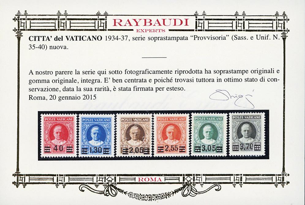 1934/37 - Provvisoria, serie completa (35/40), buona/ottima centratura, nuovi, gomma originale integra, perfetti. A.Diena, cert. Oro Raybaudi (cat.Sassone € 4.000/6.000).