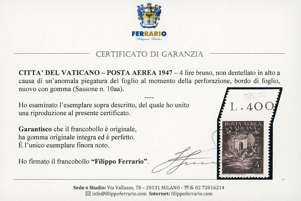 1947 - 4 lire posta aerea, non dentellato in alto a causa di un'anomala piegatura del foglio al momento della perforazione (10aa), bordo di foglio, gomma originale integra, perfetto. UNICO ESEMPLARE NOTO, citata dal catalogo Sassone. Rarità del settore. Cert. Ferrario.