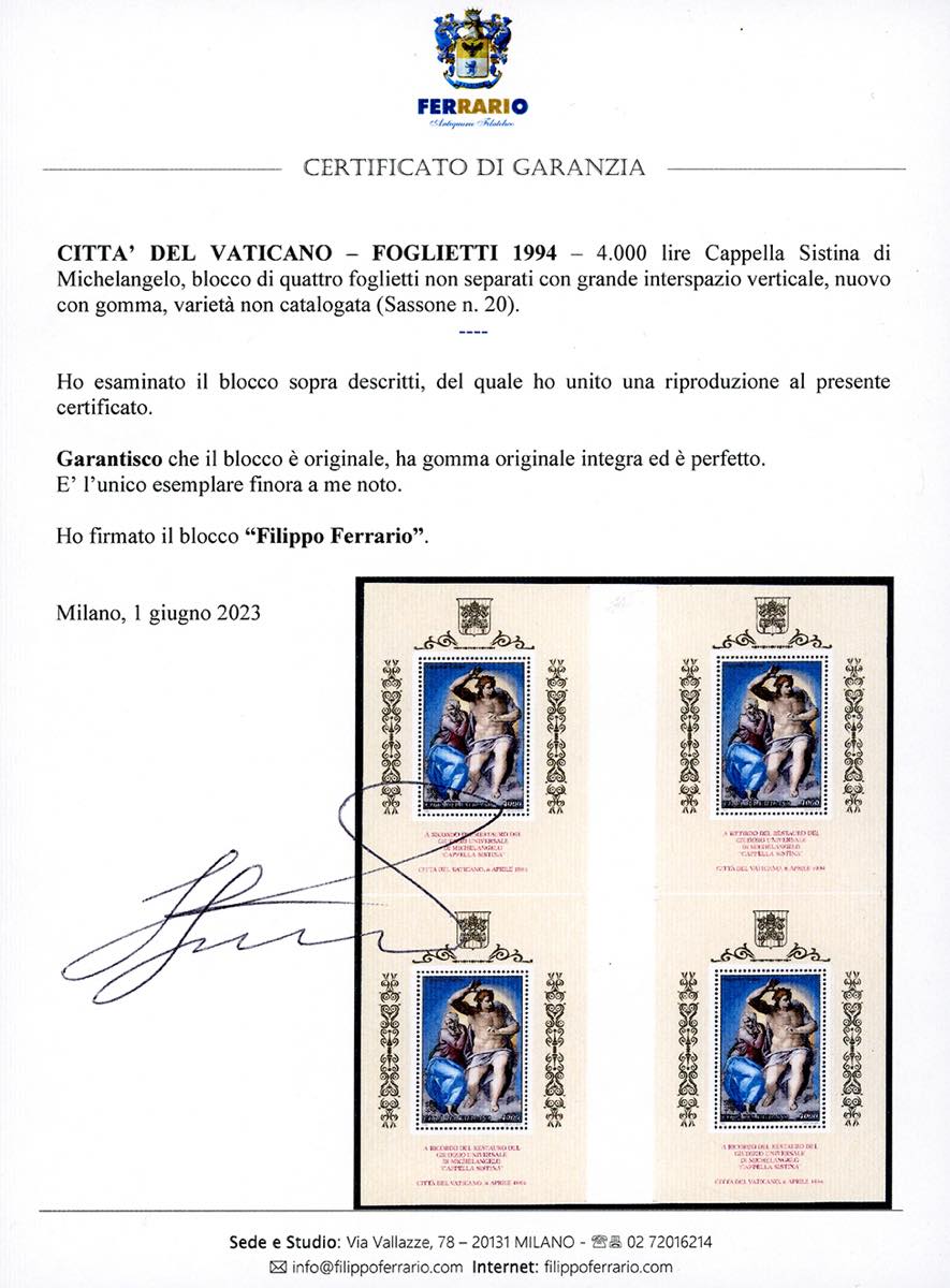 1994 - 4.000 lire Cappella Sistina di Michelangelo (20), blocco di quattro, foglietti non separati con grande interspazio verticale, gomma originale integra, perfetto. Splendido e finora UNICO NOTO! Rarità assoluta di tutte le varietà di Vaticano, non catalogato. Cert. Ferrario.