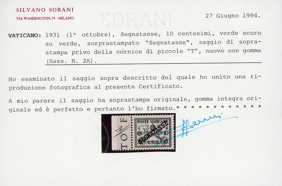 1931 - 10 cent. soprastampato "Segnatasse", senza il riquadro di piccole "T", saggio venduto come normale alla posta (2A), bordo di foglio, gomma originale integra, perfetto. Splendido e molto raro, tiratura 100 esemplari. Cert. Sorani.
