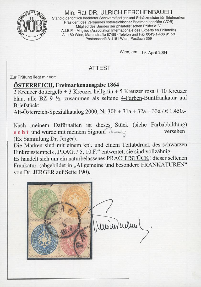 AUSTRIA 1864 - 2 kr., 3 kr., 5 kr. e 10 kr. (cat. Ferchenbauer 30b+31a+32a+33a), perfetti, usati su frammento a Praga. Bella e rara affrancatura quadricolore, ex coll. Jerger. Cert. Ferchenbauer.