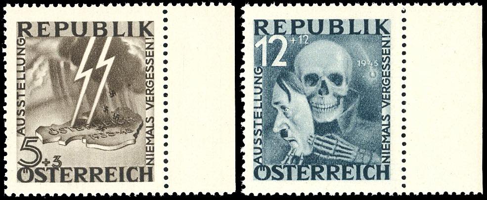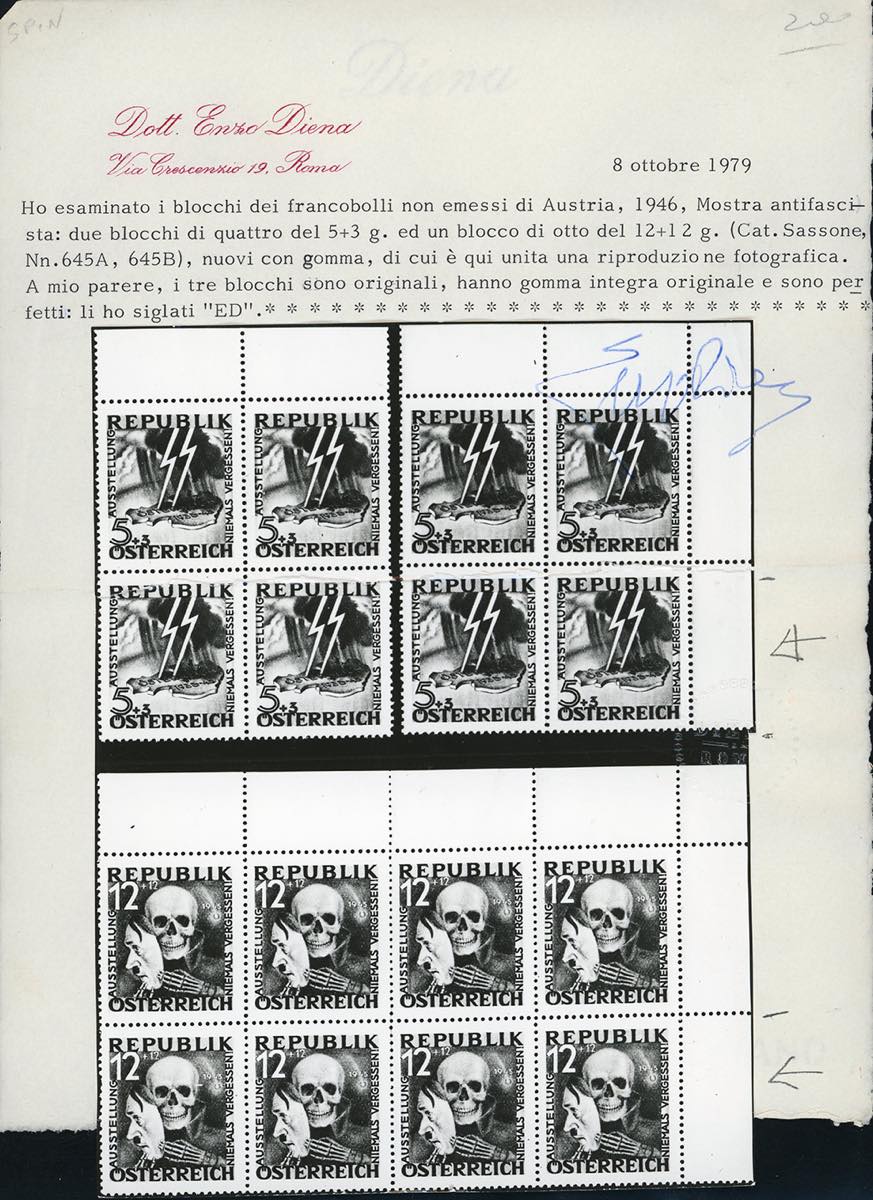 AUSTRIA 1946 - Mostra antifascista, non emessi (Unif.645A/645B), bordo di foglio, nuovi, gomma originale integra, perfetti. Molto belli. Cert. Diena del blocco di provenienza, cert. Ferrario.
