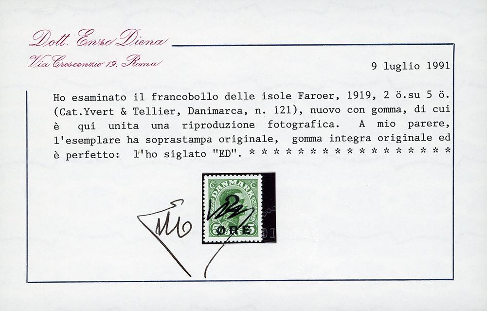 FAROER 1919 - 2 o. su 5 o. verde, francobollo di Danimarca soprastampato (1), nuovo, gomma originale integra, perfetto. Splendido per freschezza e centratura. Cert. Enzo Diena 1991.