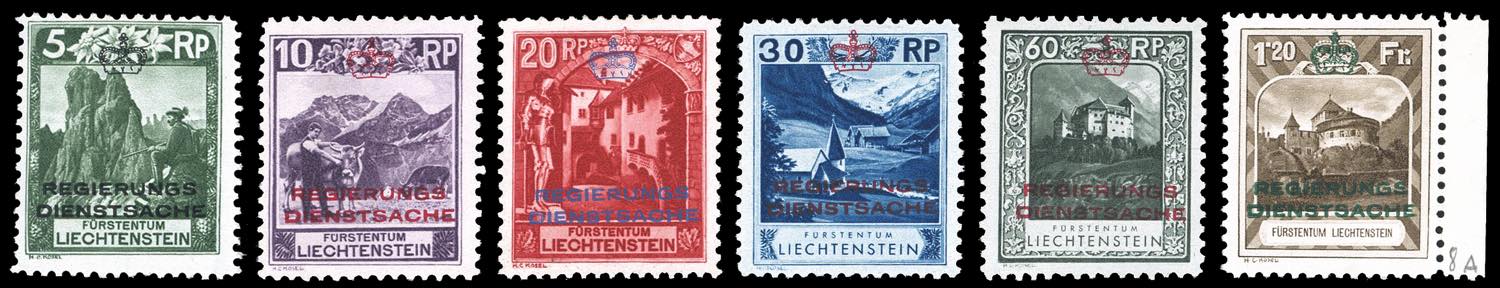 LIECHTENSTEIN SERVIZIO 1932 - Soprastampati, serie completa di 6 valori dent. 10 1/2 (Unif.1A/8A), nuovi, gomma originale integra, perfetti. Alti valori cert. Raybaudi.
