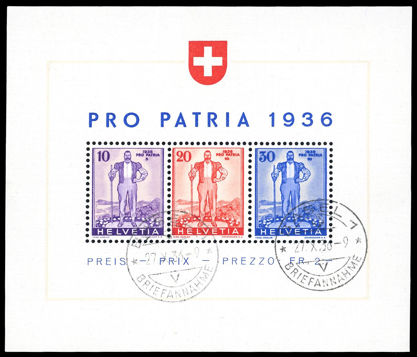 SVIZZERA FOGLIETTI 1936 - Pro Patria (Unif.BF2), usato, perfetto, bello. Cert. Renggli.