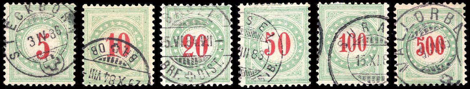 SVIZZERA SEGNATASSE 1883 - Cifre in carminio rosso, serie completa (Unif.15/20), usati, perfetti. Alti valori cert. Caffaz.