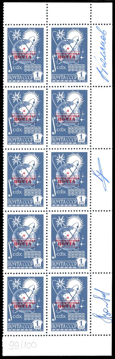 SPAZIO RUSSIA 1988 -1 r. soprastampato "KOSMICESKAYA POSTA" (Unif.5573), blocco di 10 esemplari, angolo di foglio, con gli autografi degli astronauti Volkov, Krikalev e Plyakov, gomma originale integra, perfetto. Si tratta del primo francobollo di posta spaziale al mondo.