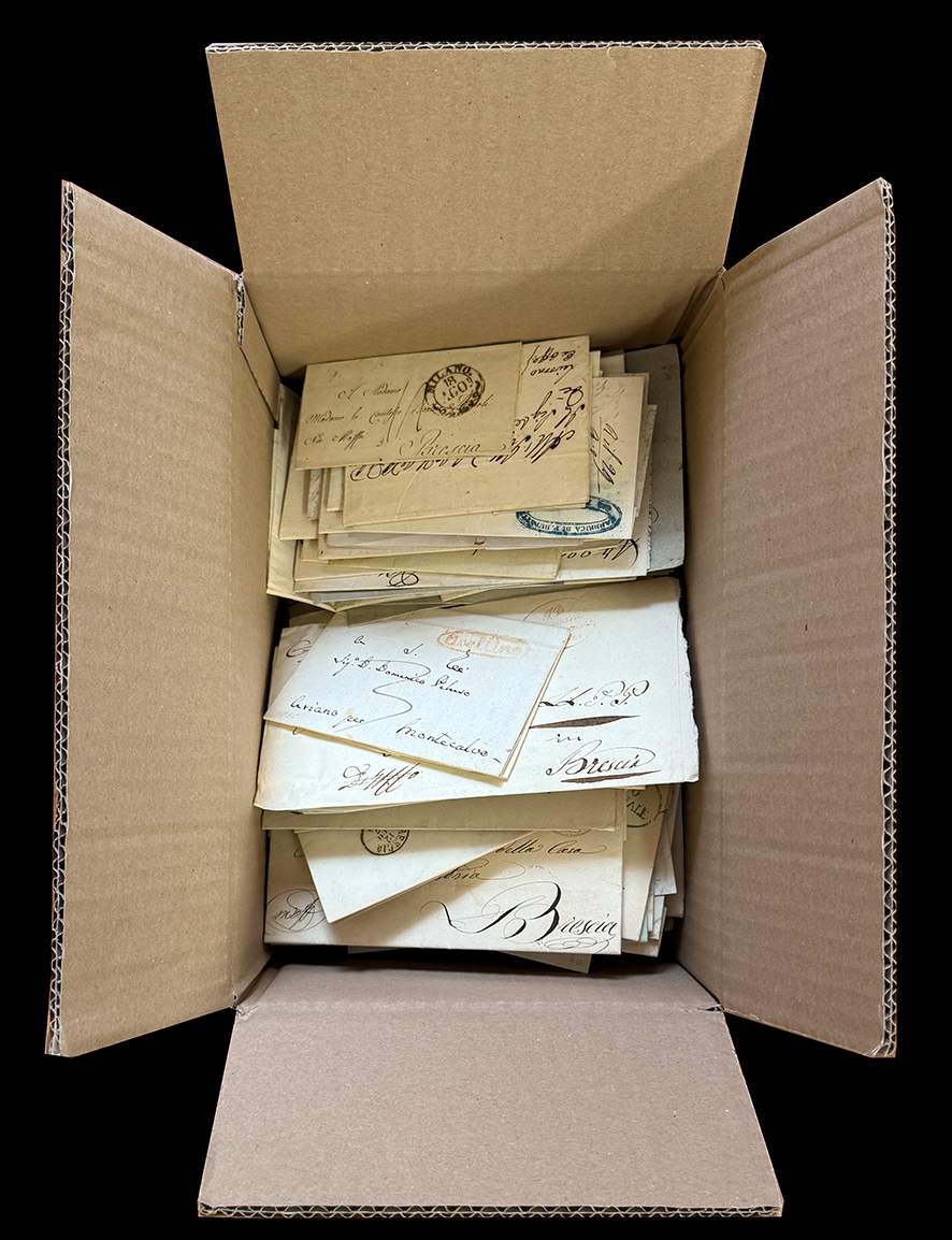 PREFILATELIA 1800/1870 - Accumulazione di oltre 200 lettere prefilateliche e non affrancate in una scatola. Ottima varietà di bolli e tariffe, notata qualche non comune presenza. Interessante per il dettaglio.
