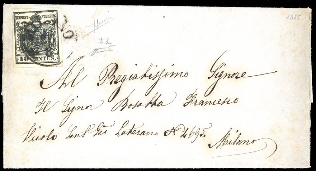 1855 - 10 cent. nero intenso, carta a mano (2d), perfetto, isolato su lettera da Milano 25/8/1855 per città. Ferrario, cert. Sorani.