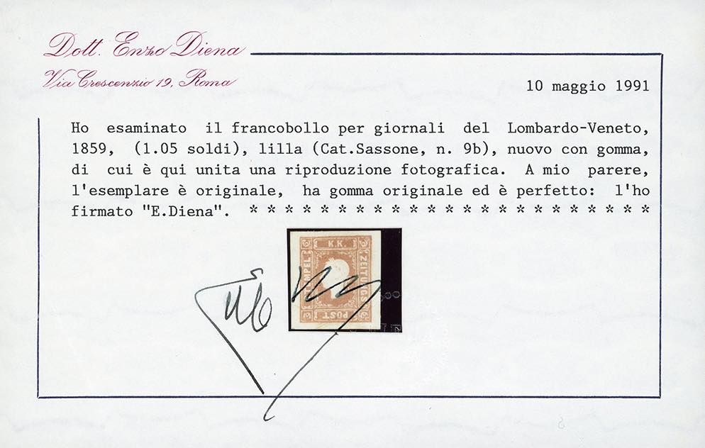 1859 - 1,05 soldi lilla (9b), nuovo, gomma originale, perfetto e ben marginato. Molto fresco, ottima qualità. G.Oliva, A.Diena, cert. E.Diena 1991.